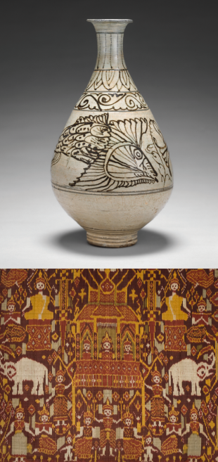 Top: Bottle with fish design, approx. 1450–1550. Korea. Stoneware with painted decoration over white slip (buncheong ware). Asian Art Museum of San Francisco, The Avery Brundage Collection, B65P63. Photograph © Asian Art Museum of San Francisco. Bottom: Temple hanging with Buddhist scenes (pidan), 1920–1950. Cambodia. Silk, ikat technique. Asian Art Museum of San Francisco, Gift of Dr. and Mrs. David Buchanan, 2007.11. Photograph © Asian Art Museum of San Francisco.