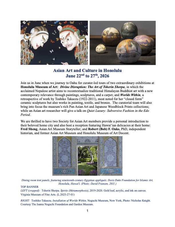 Join us on this fabulous trip. We will have curator-led tours of two extraordinary exhibitions at the Honolulu Museum of Art: Divine Disruption: The Art of Tsherin Sherpa, and Toshiko Takaezu: Worlds Within, a retrospective of work by Toshiko Takaezu (1922-2011). The curatorial team will also introduce us to the museum’s rich Pan-Asian art and Japanese woodblock prints collections and give us a talk on Quiet Luxury: Subversive Fashion in the Edo Period.